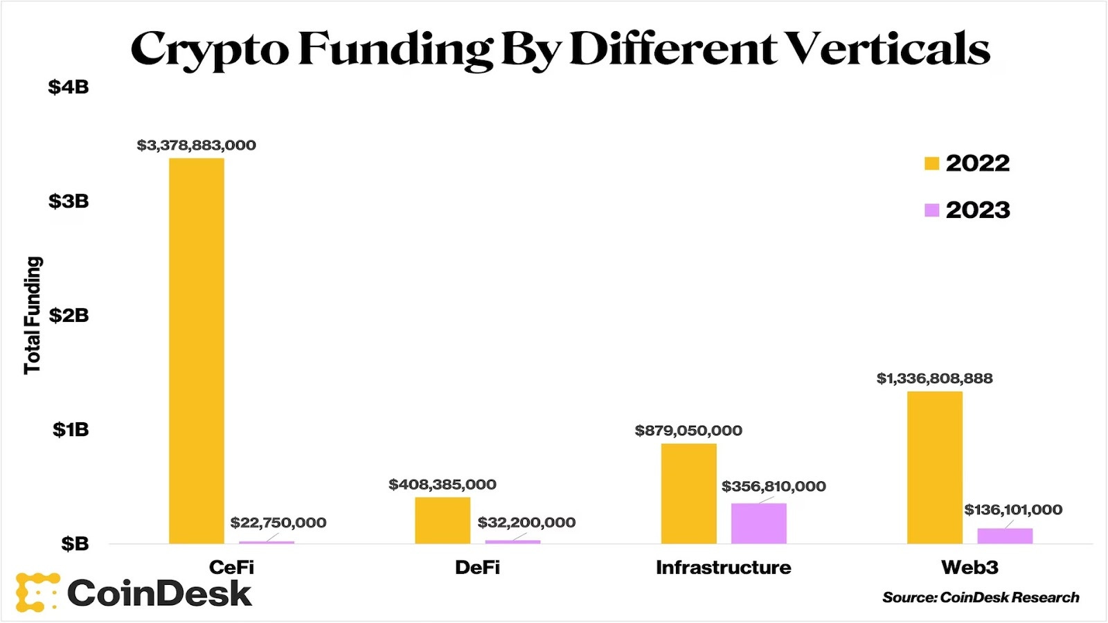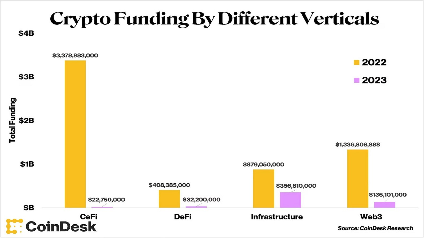 As an example, in February, Coindesk announced that the “crypto winter” led to a 91% plunge in January 2023 compared to the same period last year. According to their estimates, the total funding in the crypto industry accounted for $548M. At the same time, CeFi was the least invested and the most sensitive vertical, while infrastructure and Web3 projects received more investments.