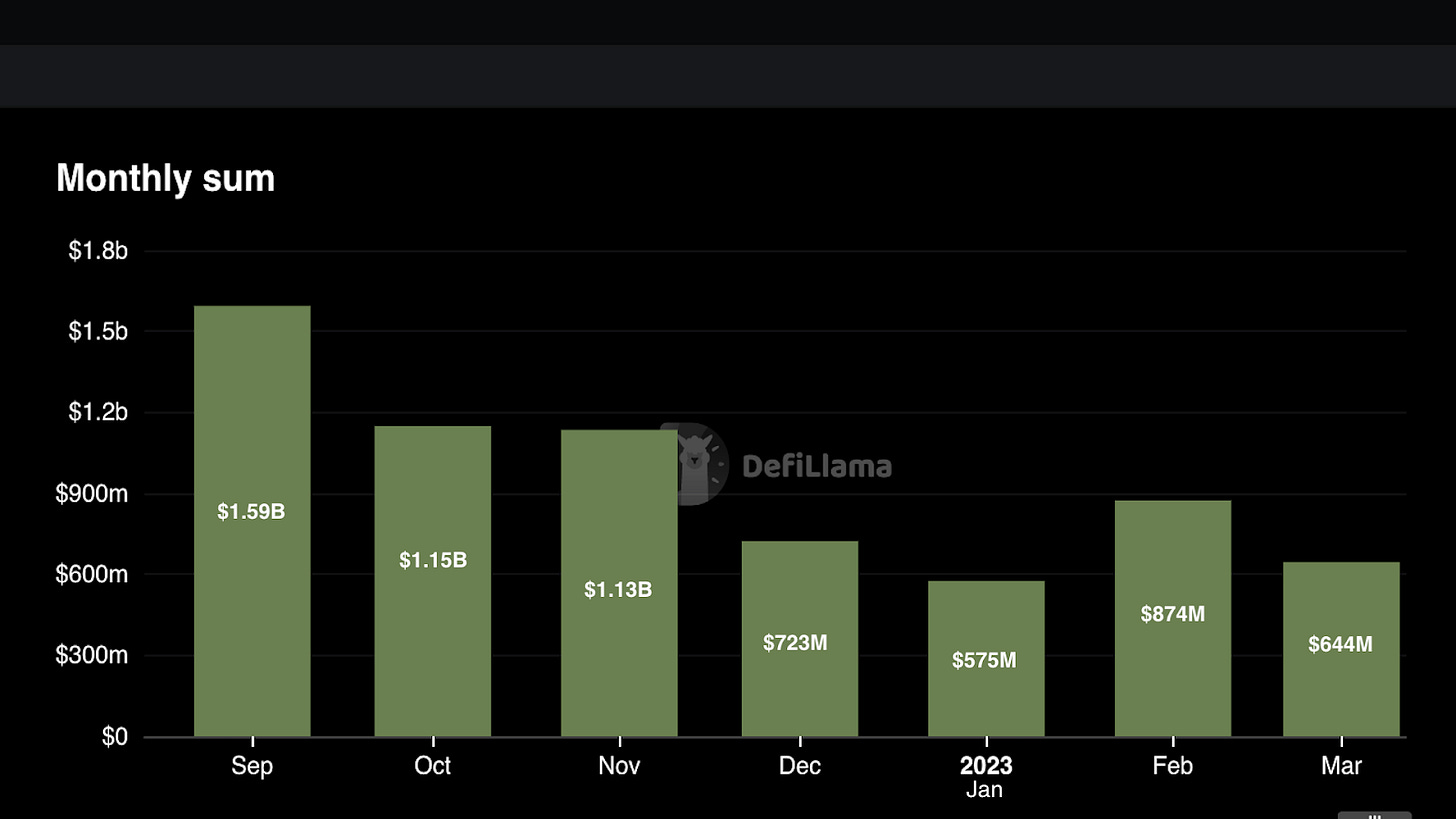 DefiLlama shows almost the same information for the first month of 2023 — $575M in total funding. At the same time, the platform indicates an increase in investments in February and March.